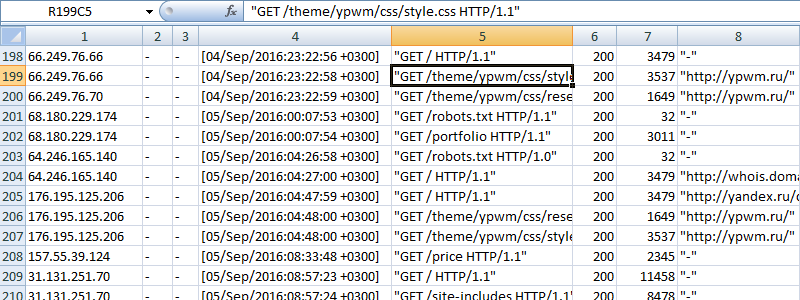 Поэтому я сделал маленькую консольную программу для преобразования логов Апача в CSV, который понимает Excel. Конечный результат выглядит примерно так: